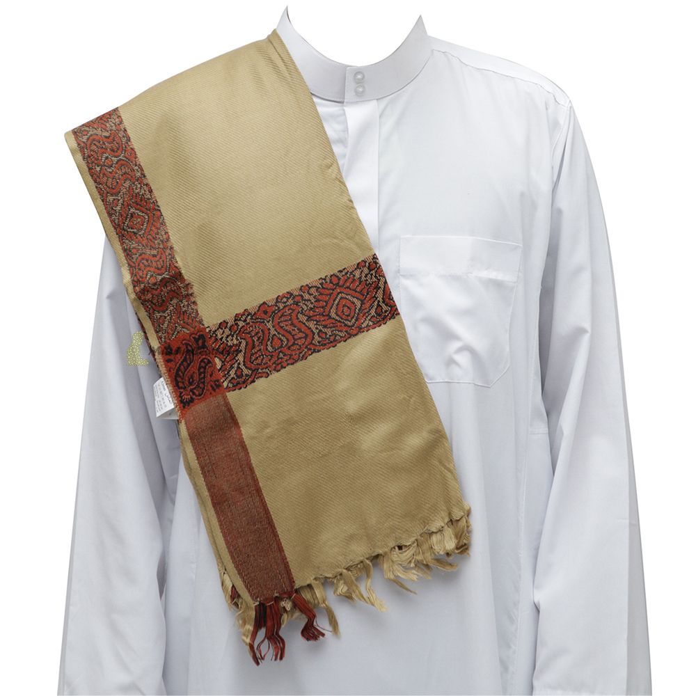 Long dark khaki Islamic Shawl with hemmed edges. A Kashmiri-style soft poly-rayon fabric men’s shawl scarf. This scarf is often worn by the Habaib, Ulama (scholars), and shuyukh (spiritual teachers) in Indonesia, Yemen, Kashmir and other Muslim/Arab countries. This dark brown scarf is known as a “sorban” in Indonesia. It can be worn as a turban, scarf or shawl. Measures 76x39" (194 x101cm). Has rust brown decorative border with hemmed edges. The decorative border may vary slightly in colors and shades.